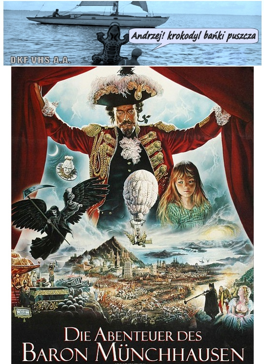 DKF VHS A.A | "THE ADVENTURES OF BARON MUNCHAUSEN" (Przygody barona Munchausena) Film fabularny. Wielka Brytania/Włochy. 1988. Barwny. 126'. Fantasy/Komedia/Przygodowy/Kostiumowy. Nominowany do 4 Oskarów, zdobywca 3 nagr. od Brytyjskiej Akademii Sztuk Filmowych film w reżyserii mistrza Terrego Gilliama. W obsadzie plejada gwiazd: John Neville, Eric Idle, Robin Williams, Uma Thurman, Sting, Terry Gilliam, Jonathan Pryce... Na ekranie 2 z 6 "Monty Pythonów". Michael Palin miał zagrać pierwszego ministra Króla Księżyca. Gdy postać została wycięta ze scenariusza, zaoferowano mu rolę irytującego piosenkarza, którą odrzucił i zamiast niego zagrał Terry Gilliam. Na podstawie powieść Gottfried August Bürger oraz powieści Rudolpha Ericha Raspe'a. Piękny plakat do filmu autorstwa Renato Casaro. 11 Nagród i 15 Nominacji.