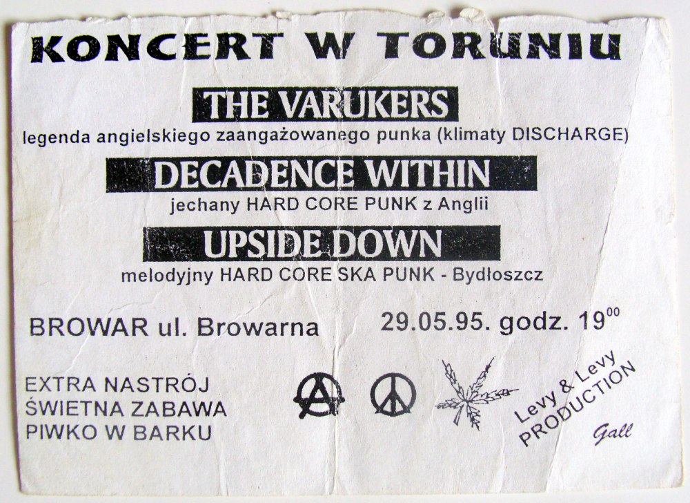 | Po trochu | Otworzyłem stara szafę, nie otwieraną od bardzo dawna i zasypały mnie setki plakatów, zdjęć, ulotek, zinów, broszur... dość archiwalnych już dziś. Systematycznie fotki tych szpargałów będą pojawiały sie tutaj... Na początek trochę plakatów z koncertów które organizowaliśmy lub na których byliśmy... Benefit Party w PIlonie - kasa dla Micha Marchaba Europe - spotkanie w Pilonie. Org. chyba Kolektyw Autonomistów I.M.K.E - to miał być najlepszy koncert w Pilu, mistrzowska kapela - niestety nie dojechali. Org. Crack Sanctus Juda - Pilon, klasyczny koncert, klasyczne kapele. Org. Crack Oi Polloi - Szybki koncert zrobiony z dnia na dzień. Org. Crack (Błażej dzięki za plakat)           Homiki - koncert na Bunkrze, Pilon był za mały na taką gwiazdę ;) Org. Crack Brother Inferior w Pilonie. Org. Crack Wspaniały koncert Trottela, wydany na taśmie przez Crack Records - 06.V.1997. Org. Crack Citizen Fish na Browarnej - 01.VI.1994. Org. L&L Prod. Nowojorski Supertouch na Rubińcu, robiony przez toruńską ekipę - 1992 lub 93 r.           Varukers na Browarnej, na rok przed powstaniem Pilona. Org. Levy & Lewy Production Koncert, Pilon - Gramy w Piłkę nawet w deszcz Ed.8. robiony przez org. turnieju. Dj. Dilinger w Pilonie!! - 10.IX.2003. Org. Crack Grrzzz po raz drugi w Pilonie - 23.V.2001. Org. Crack         Trzy niemieckie ekipy w Pilonie. Org. Crack Radio Bikini z Holandii w Pilonie - 25.VI.2003. Org. Crack Live in Pilon Soon In Here z Izraela w Pilonie - 31.VII.2003. Org. Crack       Inner Terrestrials - pamiętny koncert w Pilonie. Org. Crack Koncert ku pamięci Staśka - ChumbaWamba, Zgorzelec 1994. Org. Maken Legendarny Doom w Łodzi i całonocna zadyma z policją - 1994. Org. Wunder Wave Trottel po raz drugi w Pilonie. Org. Crack         Blanks 77 z New Yorku w Pilonie - 29.04.1997. Org. Crack Dirt w Łodzi. Pierwszy raz anarcho punk z Crass Records w Polsce. Kilkuset punków w TOTALNYM amoku. Kto był ten wie - 1993. Org. Wunder Wave 26 Dirt drugi raz w Łodzi. Szaleństwo. Org. Wunder Wave 33 Koncert ku pamięci Staśka - Hybrydy, Warszawa, 1994 Academy in the UK - Conflict, Bristol, 2007           Stratford Mercenaries drugi raz w Polsce - 2000 r. Conflict - Bristol, 1994 ChumbaWamba - europejska trasa 1994       Dropdead w Pilonie - 26.X.1998. Org. Crack Disorder w Od Nowie - 22.IV.1992. Org. Partyzant ChumbaWamba w Pradze - 01.V.1993 r. Foto Potop Szwedzki - trzy kapele + SKTC w Imperialu, 1992. Org. Sabon & Levy Kromozomer 47 - Potop szwedzki Foto           Tromatism czyli chłopaki z Berurier Noir w Bordeaux - 1994 (?) Under The Gun, Alians, Świat Czarownic w Zgorzelcu - 01.X.1993. Org. Maken Under The Gun, Feather Heads, Świat Czarownic w Poznaniu - 16.IV.1993. Org. Karolina & Łukasz Dzień po koncercie w Pilonie Inner Terrestrials w Warszawie Doom w 007, Praga           Citizen Fish, Świat Czarownic na Browarnej, druga wersja plakatu. Org. Levy & Lewy Production Dezerter w Pilonie. Org. L&L Prod. (Crack) Provoked w Pilonie - 16.IV.1993. Org. Crack Fotki z gigu Conflict, Schwartzeneggar, Dirt, Citizen Fish, RDW w Londynie         Flatpig, Restarts, Scum of Society w najstarszym anarchistycznym centrum - 121, Brixton, Londek Lord na Węglowej w Łodzi - 13.I.2001 Across the Decades 2000 - Conflict, Stefan Ignorant, Subhumans... - Milton Keynes (UK) Fate, Neuropatia, Polopiryna S - Pilon, mini tour 28/29.XI.1996. Org. Krakoś. Błażej dzięki za plakat. Wypad z Pepusem na Conflict na Force Attack - Rostock 2003           Ulotka - Varukers na Browarnej - 29.05.1995. Org. Levy & Lewy Production Concrete Sox, Fleas & Lice w Gelsenkirchen (Niemcy) Headjam w centrum anarchistycznym 121 - Brixton, Londyn       Subhumans, Zounds, System, Thatcher On Acid w Londynie Confict na Rebelion Fest - Amsterdam 2007 Rozpiska z doskonale znanego londyńskim punx klubu Goldsmiths Tavern na New Cross, a tam w każdą sobotę Paco's Racket Club czyli imprezy robione przez Paco (Conflict) "Koncert Stulecia" w Pilonie - 199? - Błażej dzięki za plakat Schwartzeneggar, Fugazi w Dormundzie - 03.VII.1995           Bilet zaproszenie na Citizen Fish na Browarnej 1.VI.1994. Org. L&L Prod. Dub Travellers - Sound System, 48 godzin muzyki non stop w Pilonie - 28.XI.1997 Bilet zaproszenie na Świat Czarownic, Alians, Spunkies w Imperialu - 23.V.1993. Org. L&L Prod.       Conflict, Inner Terrestrials w Warszawie - 04.V.2003 Subhumanas - UK tour 1998 The Feeding of the 5000 - Steve Ignorant, Conflict, Flux, Zounds, Restarts... - Londyn 2007 Conflict, Kochise - France Tour 1994 Conflict - UK Tour 1994           Conflict - "dawno, dawno temu w Bristolu.." Stratford Mercenaries pierwszy raz w Polsce - Łódz, 24.III.1998. Org. Wunder Wave Conflict, Icons of Filth, Varukers, Broken Bones, Sensa Yuma - 199? Londyn Steve Ignorant - The Last Super Tour - Łódz, 21.X.2010. Org. Wunder Wave Varukers na Zoro           GBH, Anti-Pasti w Arnhem   14:25 2014.VIII.21- L |