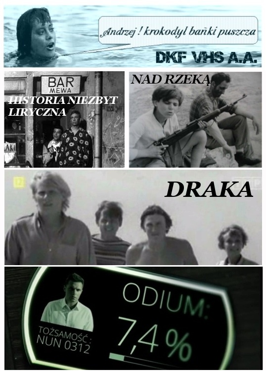 DKF VHS A.A. | "NA ULICY NIE JESTEŚ SAM" Film dokumentalny. Polska. 1966. Film oświatowy. Cz-biały, 10'. WFO (Łódź) Film edukacyjny w reżyserii Zbigniewa Kiersztejna. Przedstawia skutki wynikające z nieprzestrzegania przez pieszych obowiązujących przepisów ruchu drogowego. "HISTORIA NIEZBYT LIRYCZNA" Etiuda szkolna. Polska. 1961. Cz-biały, 9'. Etiuda fabularna. PWSTiF (Łódź) Etiuda szkolna w reżyserii przyszłego twórcy "07 zgłoś się" Krzysztofa Szmagiera. W głównej roli kobiecej Maria Wachowiak!! "NAD RZEKĄ" Film fabularny - telewizyjny. Polska. 1962. Cz-biały, 800 m. 23'. Język: polski/niemiecki. Wojenny. SMFF Se-Ma-For. Krótkometrażowy film telewizyjny w reżyserii Janusza Kubika. W jednej w głównych ról Franciszek Pieczka. "ODIUM" Etiuda szkolna. Polska. 2012. Barwny. 22'. Etiuda fabularna. Dyplom licencjacki. Sci-Fi. ZF Aberracja. Etiuda szkolna w reżyserii Leszeka Hendzela. Niedaleka przyszłość, społeczeństwo żyje zgodnie i bez agresji, oraz... pod totalną kontrolą systemu... II Nagroda w konkursie "Na linii czasu" na Międzynarodowym Festiwalu Filmu Artystycznego (Lublin). "DRAKA" Film fabularny - telewizyjny. Polska. 1970. Cz-biały. 24'. ZF Tor. Krótkometrażowy film telewizyjny w reżyserii Janusza Kubika. W jednej w głównych ról Ewa Szykulska i po raz pierwszy na ekranie Krzysztof Majchrzak. Film jest klasycznym pułkownikiem, przeleżał na półce 11 lat, zanim doczekał się premiery 02.02.1981 roku. "SAMOGONSHCHIKI" (Bimbrownicy) Film fabularny. Krótkometrażowy. ZSRR. 1961. Barwny. 24'. Niemy. Komedia. Wyśmienita krótkometrażowa komedia z ''morałem", o skutkach nielagalnej produkcji samogonu, w reżyserii Leonida Gaidai'ewa.