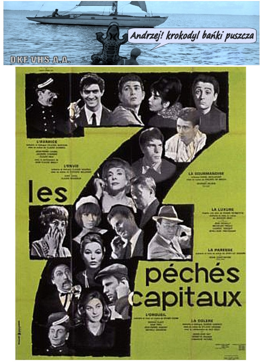 DKF VHS A.A. | "POWIETRZA!" Film fabularny. Polska. 1985. Cz-biały. 3'. Krótkometrażowy. Dokumentalny/Muzyczny. Powietrza! to dwu- i pół minutowy film przedstawiający pogo na festiwalu w Jarocinie. Robakowski nakręcił go własnoręcznie stojąc z kamerą w samym środku tłumu. Dzięki swojej postawnej posturze artysta mógł zanurzyć się w szaleńczym pogusie, nie dając się mu się jednocześnie porwać. Film jest unikatowym nagraniem występu na żywo zespołu Moskwa. "LES SEPT PÉCHÉS CAPITAUX" (Siedem grzechów głównych) Film fabularny. Francja/Włochy. 1962. Cz-biały. 115'. Nowelowy. Komedia/Obyczajowy. Siedem nowel w reżyserii siedmiu francuskich mistrzów kina: Claude Chabrol, Philippe de Broca, Édouard Molinaro, Jean-Luc Godard, Roger Vadim, Jacques Demy, Sylvain Dhomme.