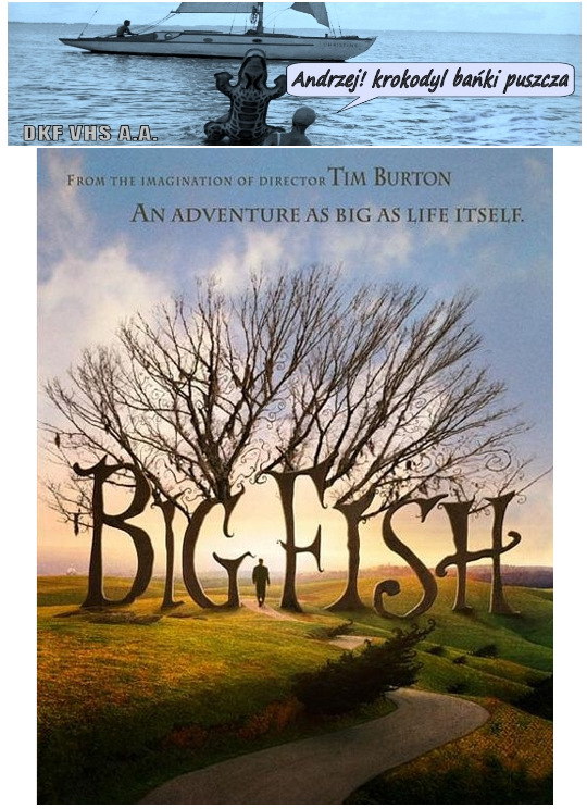 DKF VHS A.A. | "BIG FISH" (Duża ryba) Film fabularny. USA. 2003. Barwny. 125'. Fantasy/Dramat/Komedia. Film w reżyserii Tima Burtona, na podstawie powieści Daniela Wallace "Big Fish: A Novel of Mythic Proportions". Jak zwykle w filmach Tima Burtona obraz przepełniony jest magią, abstrakcją, groteską, gdzie świat fantazji miesza się z rzeczywistością.