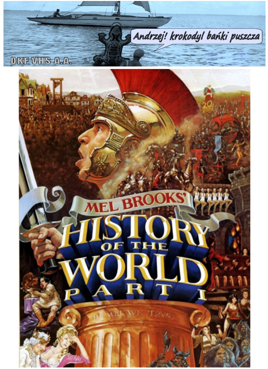 DKF VHS A.A. | "MIASTO" Film animowany. Polska. 1963. Barwny. 240 m. 8'. Film wycinankowy. Film wycinankowy w reżyserii Mirosława Kijowicza. Smutna refleksja na temat natury człowieka. Nagrody: Warna MFF o Architekturze. "TAYNA" (Tajemnica) Film fabularny. Rosja. 2011. Barwny. 7'. Krótkometrażowy. Krótkometrażowy film w reżyserii twórcy "Lewiatana" Andrieja Zwiagincewa. Tajemnicza refleksja na temat natury człowieka. Nominacje: Warszawski Międzynarodowy Festiwal Filmowy. "CÓLERA" (Cholera) Film fabularny. Hiszpania. 2013. Barwny. 7'. Krótkometrażowy. Horror. Krótki metraż w reżyserii Aritza Moreno. Straszna refleksja na temat natury człowieka. "ERNST & LYSET" (Ernst i Światło) Film fabularny. Dania. 1996. Barwny. 12'. Krótkometrażowy. Komedia. Komedia krótkometrażowa w reżyserii twórcy "Jabłek Adama" Andersa Thomasa Jensena i Tomasa Villuma Jensena. Śmieszna refleksja na temat natury człowieka. Nominacja do Oskara. "HISTORY OF THE WORLD: PART I" (Historia świata: Część I) Film fabularny. USA. 1981. Barwny. 97'. Komedia/Historyczny/Musical/Przygodowy. Szalona, absurdalna i zwariowana historia świata według Mela Brooksa, z której dowiemy się wszystkiego o: czasach prehistorycznych, prawdziwej liczbie przykazań, losach Jezusa, potędze Imperium Rzymskiego i palących dzojty Rzymianach, tańczącej Hiszpańskiej Inkwizycji, rewolucji francuskiej...