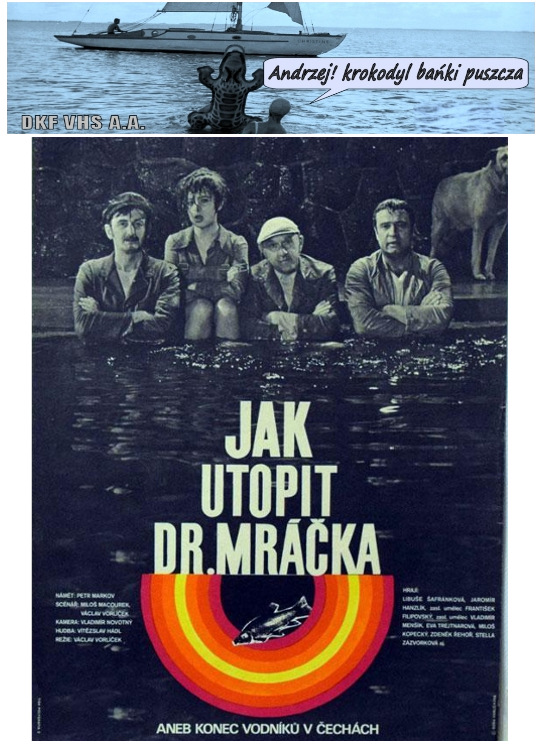 DKF VHS A.A. | "JAK UTOPIT DR. MRÁČKA ANEB KONEC VODNÍKŮ V ČECHÁCH" (Jak utopić doktora Mraczka) Film fabularny. Czechosłowacja. 1974. Barwny. 96'. Fantasy/Komedia/Romans. Urocza komedia absurdu, twórcy "Arabeli" Václava Vorlíčka. Analogicznie jak przy pracy nad "Arabelą" scenariusz napisany został przez reżysera wspólnie z Milošzem Macourekiem. Mieszkającej nad brzegiem Wełtawy rodzinie wodników grozi zagłada z powodu przesiedlenia do nowego, suchego mieszkania w blokach z centralnym ogrzewaniem. Za przydział nowego lokalu i nakaz eksmisji odpowiedzialny jest doktor Mraczek, pracownikiem urzędu lokalowego...