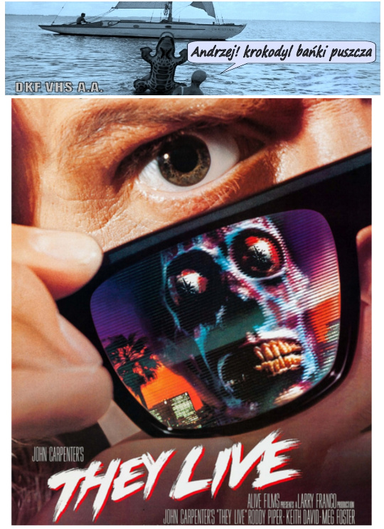 DKF VHS A.A. | "THEY LIVE" (Oni żyją) Film fabularny. USA. 1988. Barwny. 93'. Sci-Fi. Film Johna Carpentera na podstawie opowiadania "Eight O'Clock in the Morning" Ray'a Nelsona. Obraz zaliczany do klasyki ze względu na swoje do dziś aktualne przesłanie. Podobnie jak w filmach "1984" czy "Matrix" do czynienia mamy z ostrzeżeniem przed manipulowaniem i podporządkowaniem społeczeństwa przez elity tego świata, zwane też czasem Iluminatami. Chodzi o znaną od lat teorię spiskową zwaną "New World Order", według której elity chcą zniewolić ludzkość poprzez powszechne pranie mózgu, utworzenie jednej zależnej religii, wszczepianie ludziom chipów, totalnej inwigilacji, przekazów podprogowych w Tv i mediach... Oczywiście pojawiła się też teoria mówiąca że obcy w filmie to Reptilianie.