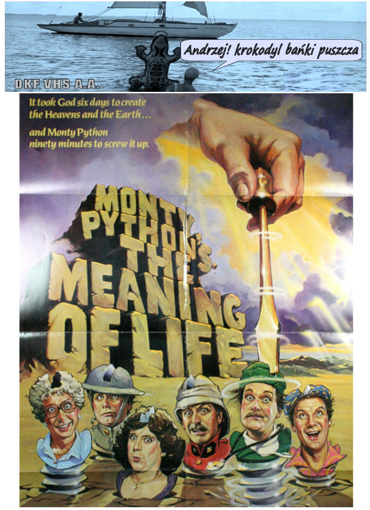 DKF VHS A.A. | ""THE MEANING OF LIFE" (Sens życia wg Monty Pythona) Film fabularny. USA. 1983. Barwny. 107'. Komedia/Satyra. Klasyk. Jaki jest właściwie sens życia? - na to pytanie odpowiada John Cleese, Graham Chapman, Eric Idle, Terry Gilliam, Terry Jones i Michael Palin, czyli niezastąpiona grupa Monty Python.