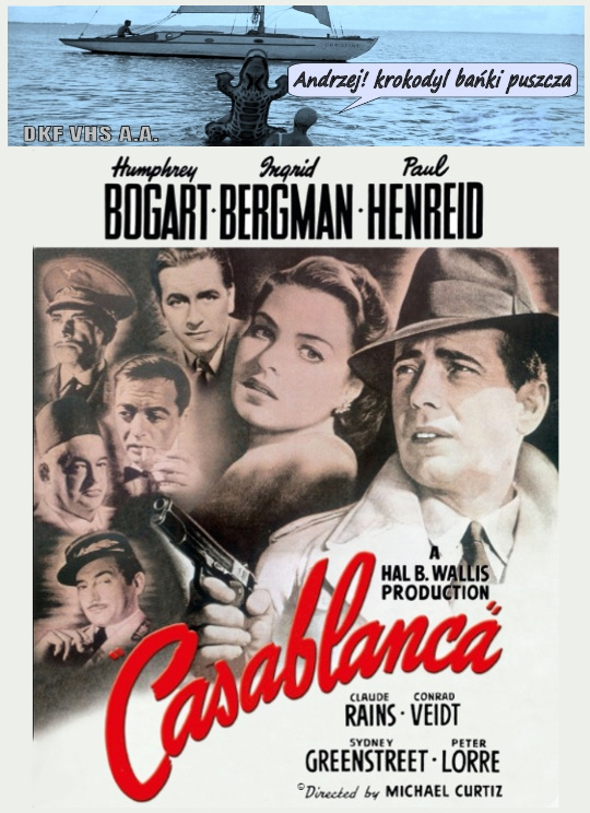 DKF VHS A.A | "CASABLANCA". Film fabularny. USA. 1942. Cz-biały. 102'. Kryminał/Dramat/Wojenny/Romans. Klasyk w reżyserii Michaela Curtiza, a właściwie Manó Kertésza Kaminera (ur. się w 1886 r. w Budapeszcie). Zdjęcia wykonał Arthur Edeson (Sokół maltański, Nocna wyprawa, Niewidzialny człowiek, Frankenstein). W roli głównej Humphrey Bogart. Bogart nosił buty na koturnie, żeby wydawać się wyższym od swojej filmowej partnerki - Ingrid Bergman. Aktorka Michele Morgan chciała za główną rolę kobiecą 50.000 $. Kiedy producenci dowiedzieli się, że mogą pozyskać Ingrid Bergman za połowę mniejszą kwotę, powierzyli ją szwedzkiej aktorce. Po tym jak George Raft odmówił zagrania w filmie, wytwórnia Warner Brothers postanowiła zakwalifikować go do kategorii "B". Nagrody (18): Oscary (Najlepszy film, Najlepszy reżyser, Najlepszy scenariusz)... Nominacje(5): Oscary...
