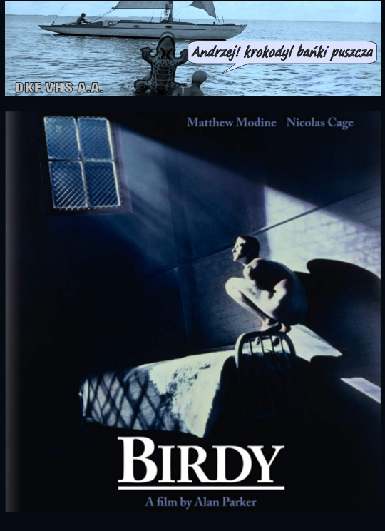 DKF VHS A.A | "BIRDY" (Ptasiek) Film fabularny. USA. 1984. Barwny. 120'. Dramat/Wojenny/Psychologiczny. Klasyk w reżyserii Alana Parkera. W rolach głównych Matthew Modine i Nicolas Cage. Muzykę skomponował Peter Gabriel. Na podstawie powieści Williama Whartona "Ptasiek". Nagrody: Cannes (Technical Grand Prize - Najlepszy film), Warszawski FF (Nagr. Publiczności), Faro Island FF (Najlepszy film), Cannes (nominacja do Złotej Palmy), National Board of Review (Najlepszy film)...