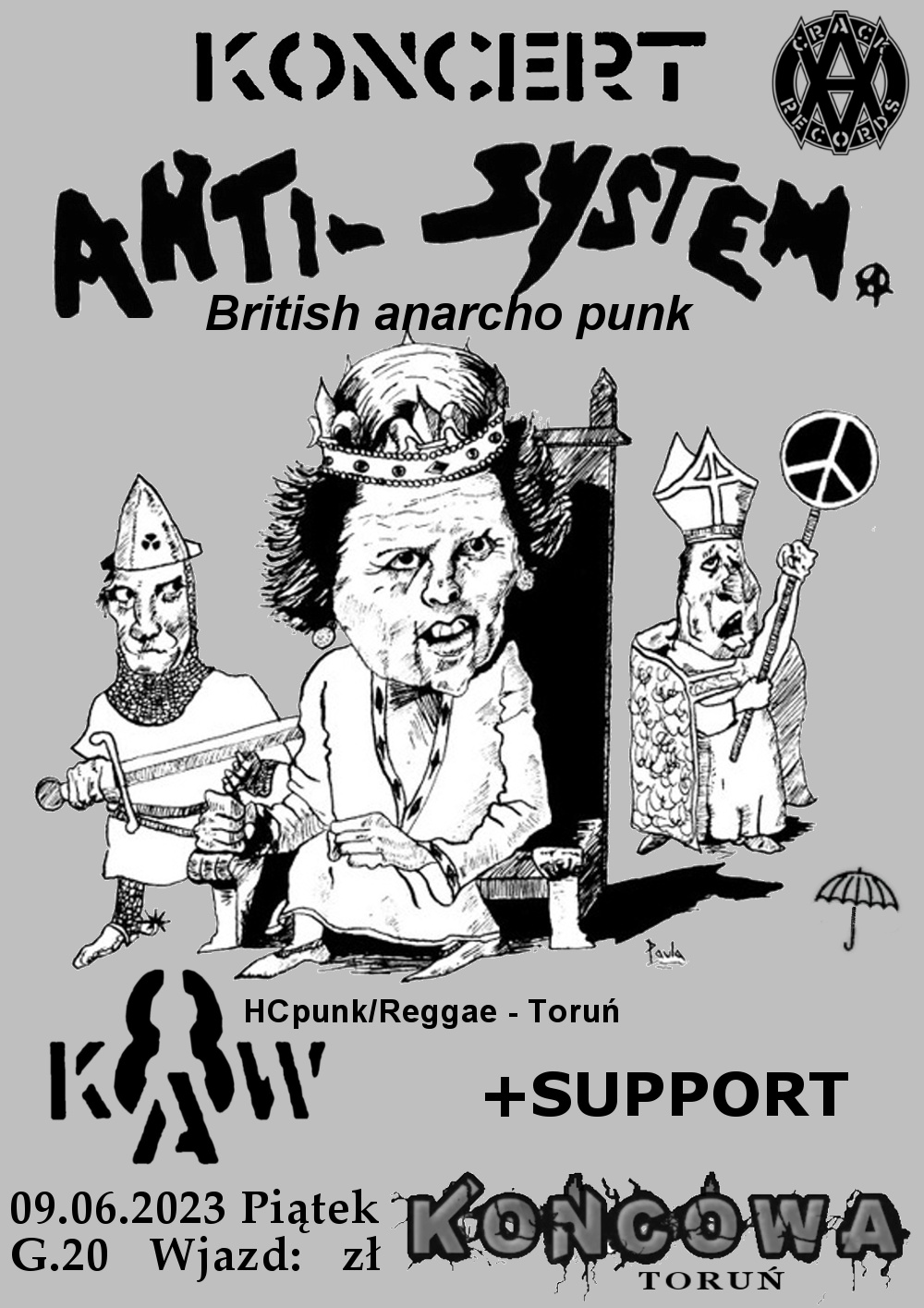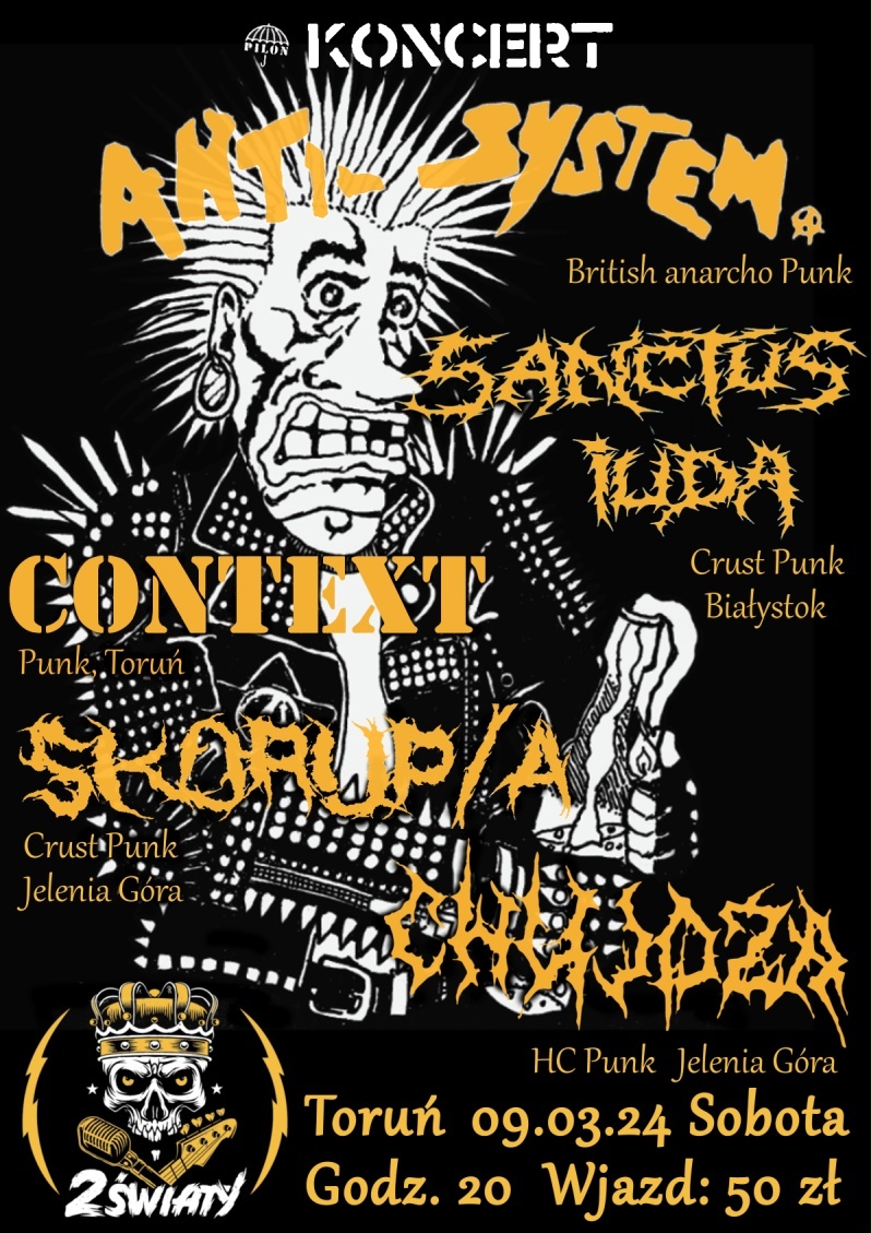 KONCERT | SANCTUS IUDA (Anarcho Crust Punk / Białystok) Koncert 2Światy: Sanctus Iuda ANTI-SYSTEM (Anarcho Punk / UK) Koncert 2Światy: AntiSystem Koncert 2Światy: youtube/AntiSystem CONTEXT (Punk / Toruń) Koncert 2Światy: youtube/Context SKORUP/A (Crust Punk / Jelenia Góra) Koncert 2Światy: Skorup/a CHUJOZA (HC Punk / Jelenia Góra) Koncert 2Światy: youtube/Chujuoza Wjazd: 50 pln