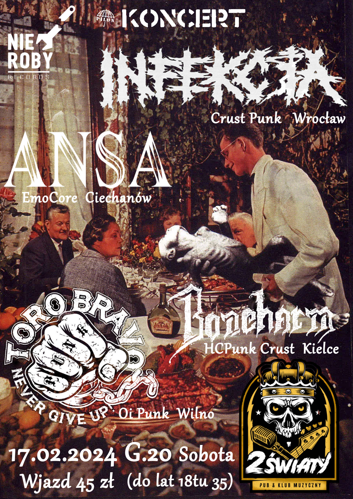 KONCERT | INFEKCJA (Crust Punk / Wrocław) TORO BRAVO (Oi! Punk / Wilno) ANSA (Emo HC Punk / Ciechanów) BONEHARM (Crust HC / Kielce) Wjazd: 45 pln facebook.com/events/409127014872821