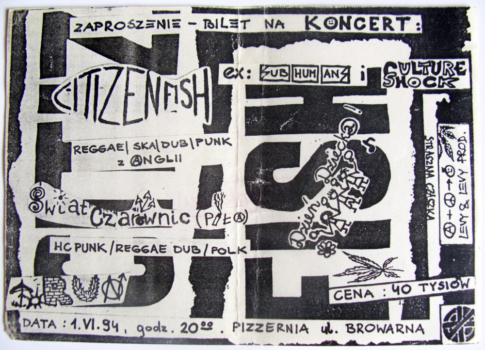 Bilet zaproszenie na Citizen Fish na Browarnej 1.VI.1994. Org. L&L Prod. Dub Travellers - Sound System, 48 godzin muzyki non stop w Pilonie - 28.XI.1997 Bilet zaproszenie na Świat Czarownic, Alians, Spunkies w Imperialu - 23.V.1993. Org. L&L Prod.