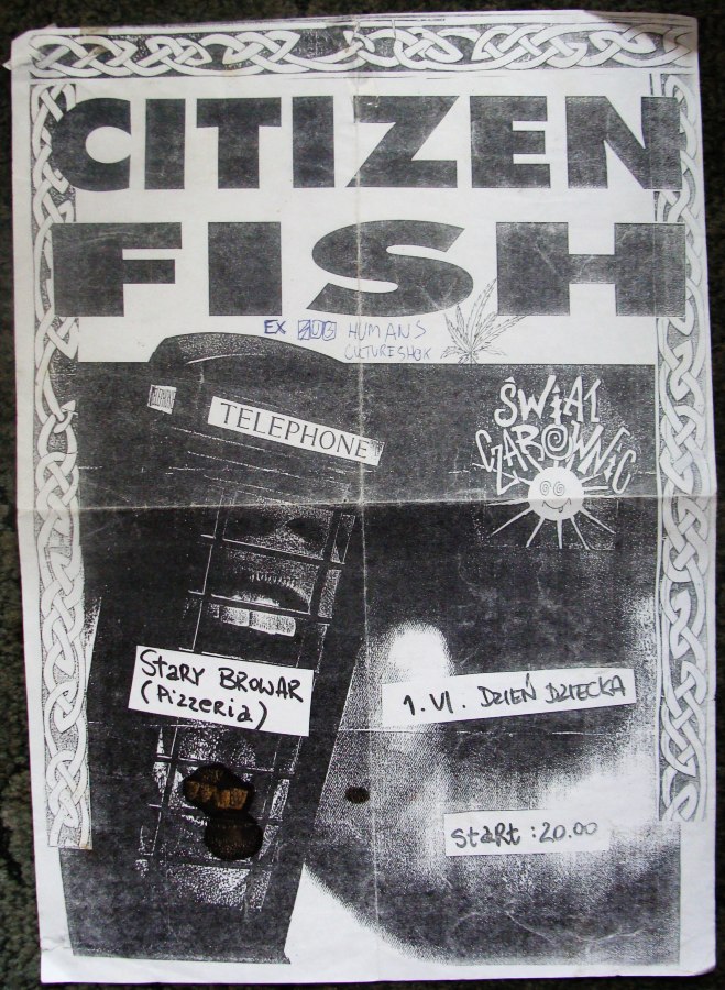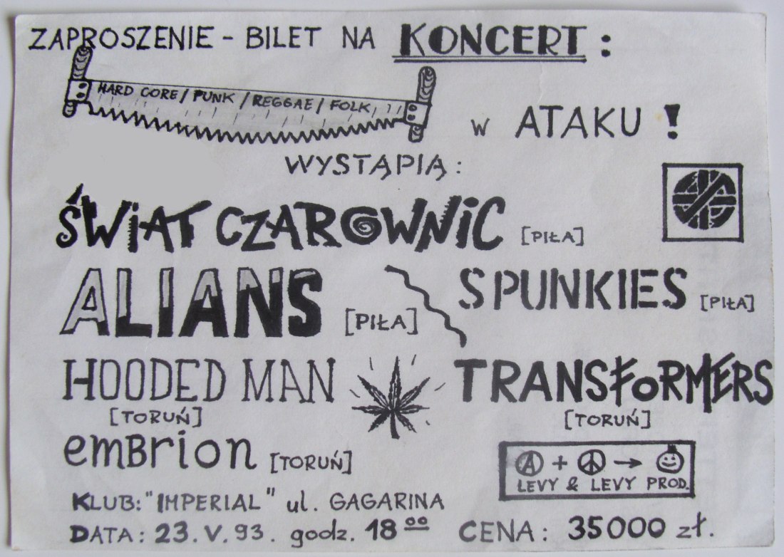 Citizen Fish, Świat Czarownic na Browarnej, druga wersja plakatu. Org. Levy & Lewy Production Dezerter w Pilonie. Org. L&L Prod. (Crack) Provoked w Pilonie - 16.IV.1993. Org. Crack Fotki z gigu Conflict, Schwartzeneggar, Dirt, Citizen Fish, RDW w Londynie