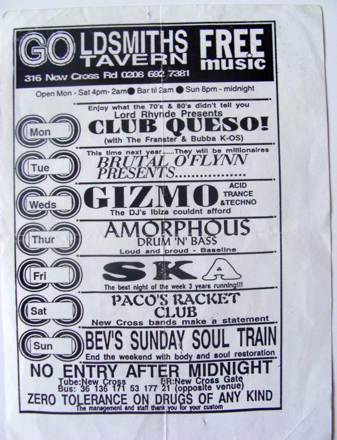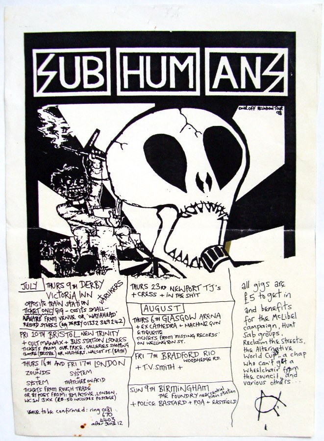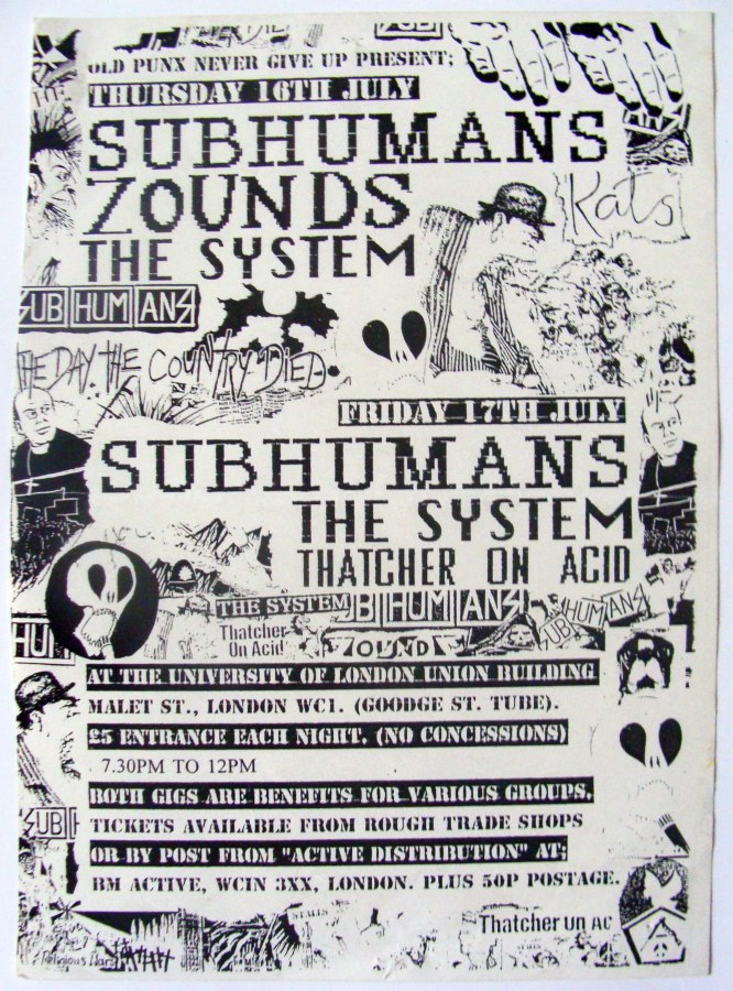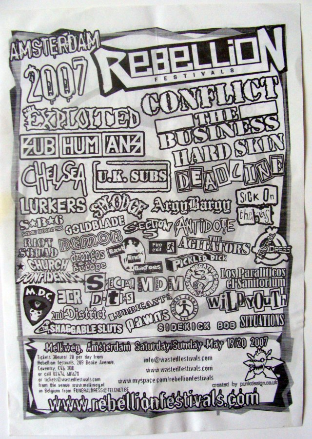 Subhumans, Zounds, System, Thatcher On Acid w Londynie Confict na Rebelion Fest - Amsterdam 2007 Rozpiska z doskonale znanego londyńskim punx klubu Goldsmiths Tavern na New Cross, a tam w każdą sobotę Paco's Racket Club czyli imprezy robione przez Paco (Conflict) "Koncert Stulecia" w Pilonie - 199? - Błażej dzięki za plakat Schwartzeneggar, Fugazi w Dormundzie - 03.VII.1995